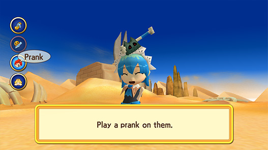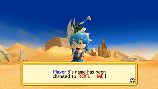 If you defeat another play in battle, you can play a "prank" on them! You can give them an embarrassing name, make them wear ugly wigs, or doodle on their faces! Let's prank each other!
