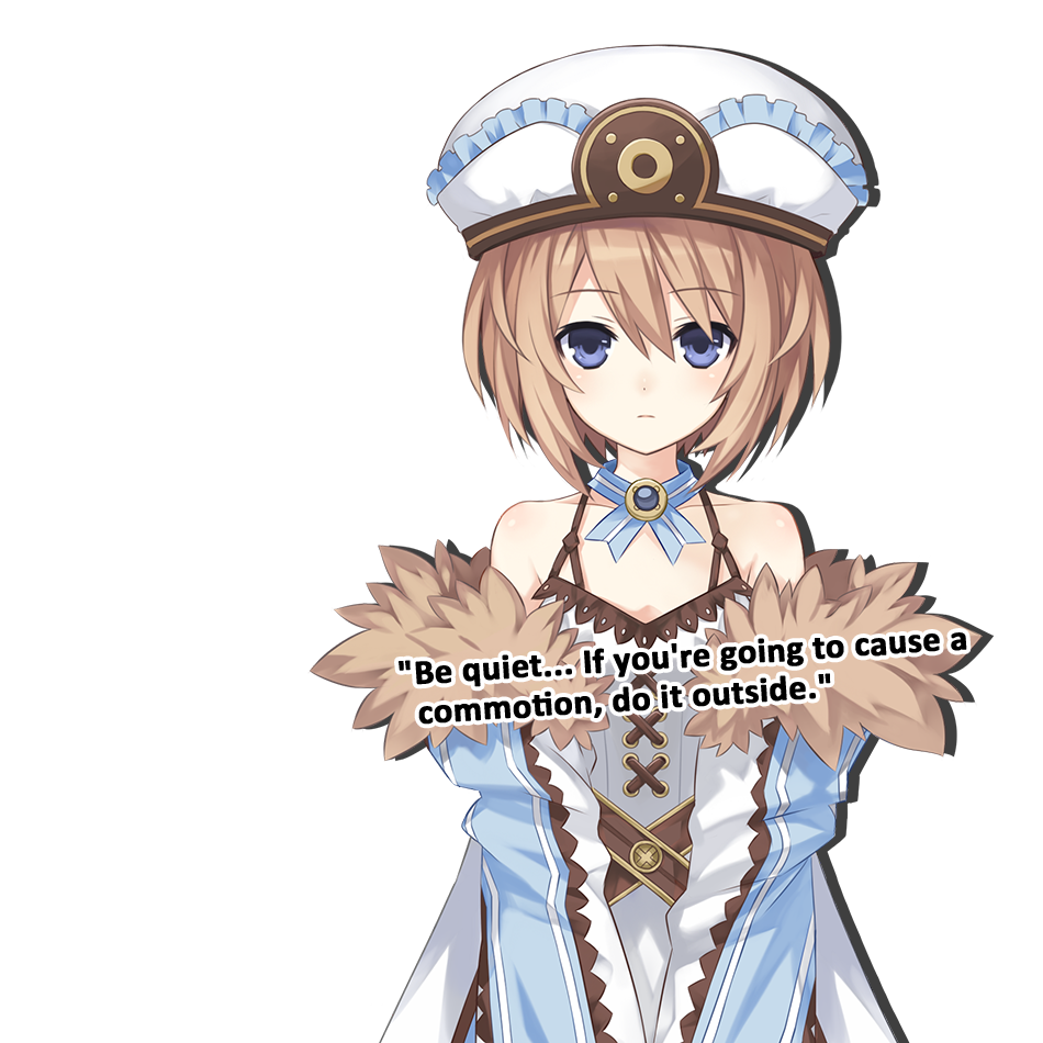 The CPU and protector of Lowee. She's a lover of books and solitude. Although she is usually quite reserved, no one can stop her once she snaps. Neptune thinks of her as a firecracker with a short fuse.