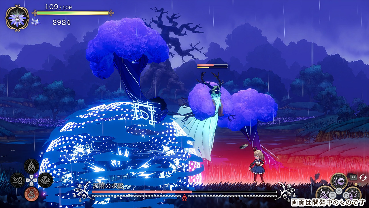 The boss, Water Spirit of Light Rain, attacks with water orbs and tree-like arms.
