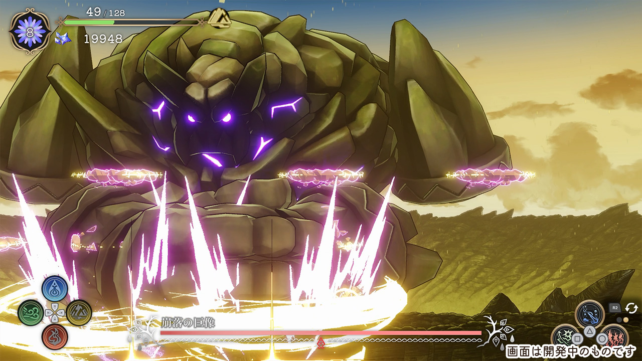 The boss, Colossus of Catastrophe, attacks in a wide range with giant arms and shockwaves.