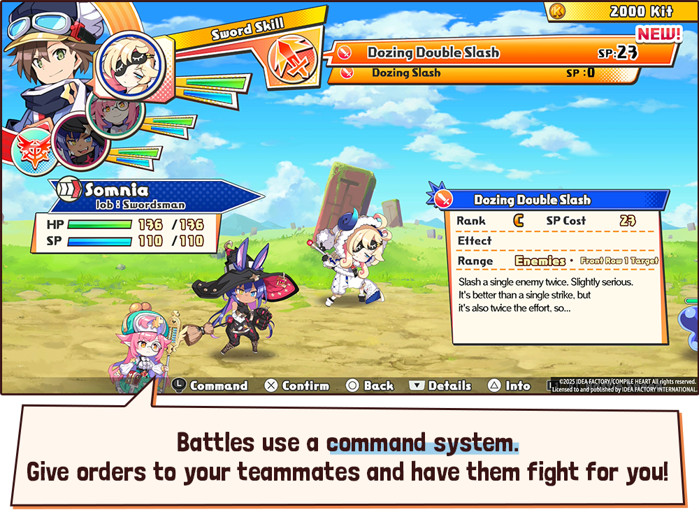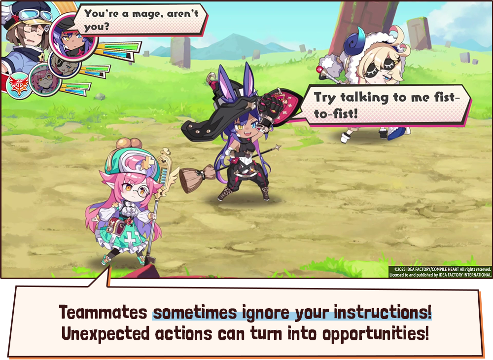 In battle, your headstrong teammates may act on a whim! Their unpredictability can lead to surprising benefits or land you in unexpected trouble... But that uncertainty is half the fun! Enjoy lively banter in this fresh, chaotic, and action-packed battle experience!