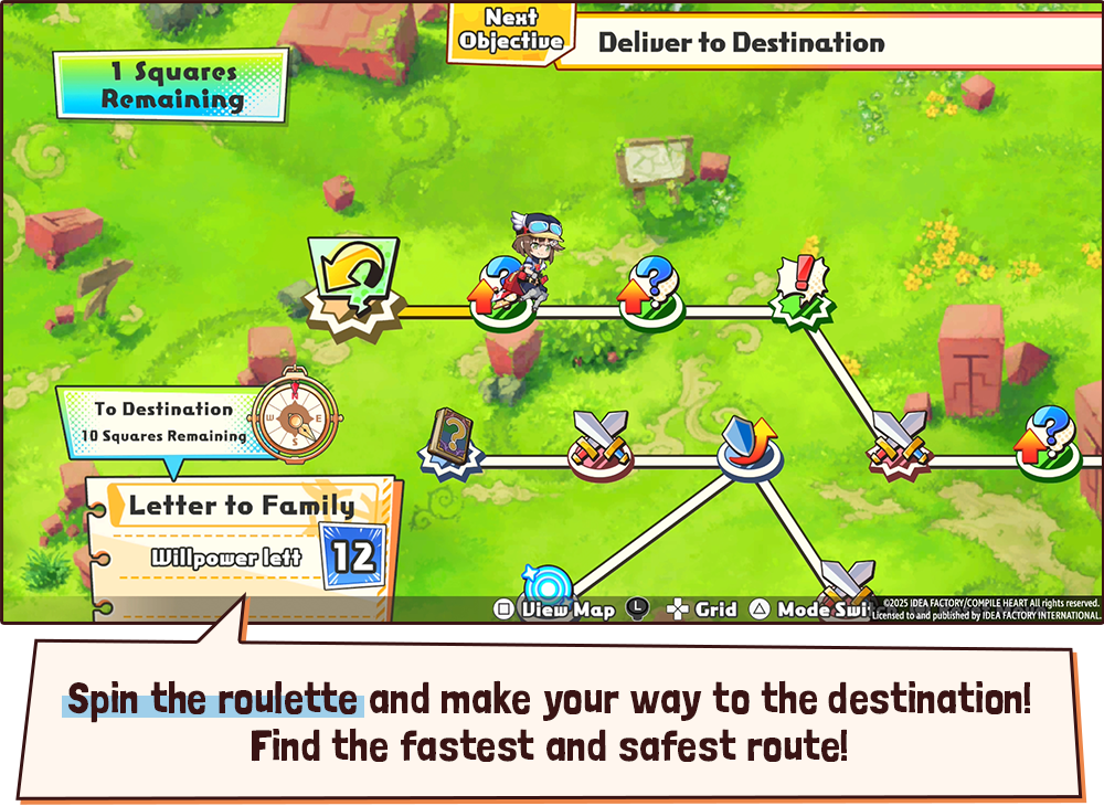 Move across the map in a roulette-style board game! Depending on where you land, you'll trigger all sorts of events and battles. Will you aim for the shortest route to your destination, or take a detour for a safer path? The choice is yours!