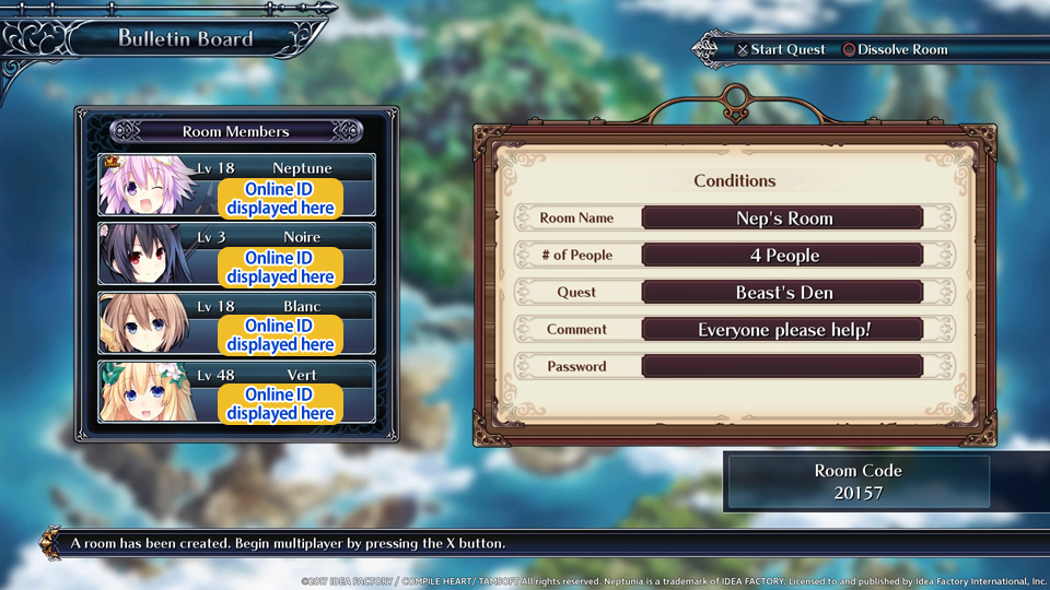 In Room Creation, you can create a room by selecting your required conditions, such as number of participating people and the Quest you'd like to attempt.