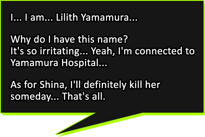 The earthbound spirits are more of a concept—technically, even ghosts are called Ludens in this world. So she's essentially a spirit who was given flesh and made to resemble Lily. Due to lingering memories, she knows about Yurisa Yamamura. She also knows about Shina Ninomiya through Yamamura, so she doesn't seem too confused. However, her brain has been tampered with to increase feelings of love and violence, making her emotionally unstable. She's frequently angry at others and even at herself.