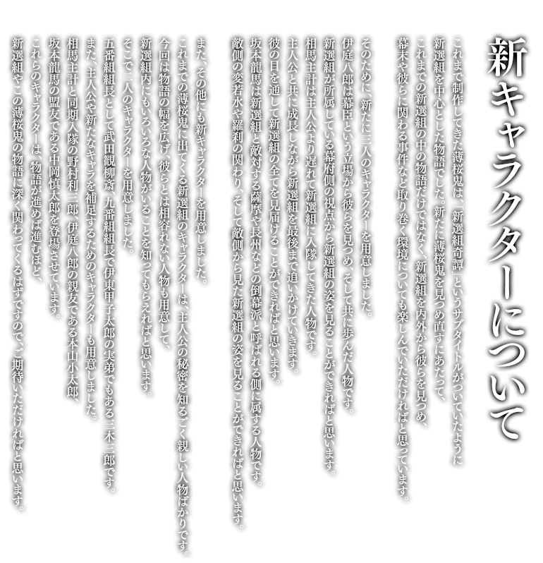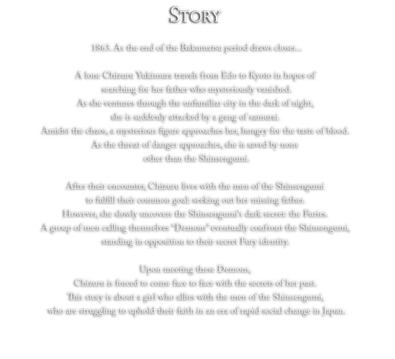 Upon meeting these Demons, Chizuru is forced to come face to face with the secrets of her past. This story is about a girl who allies with the men of the Shinsengumi, who are struggling to uphold their faith in an era of rapid social change in Japan.