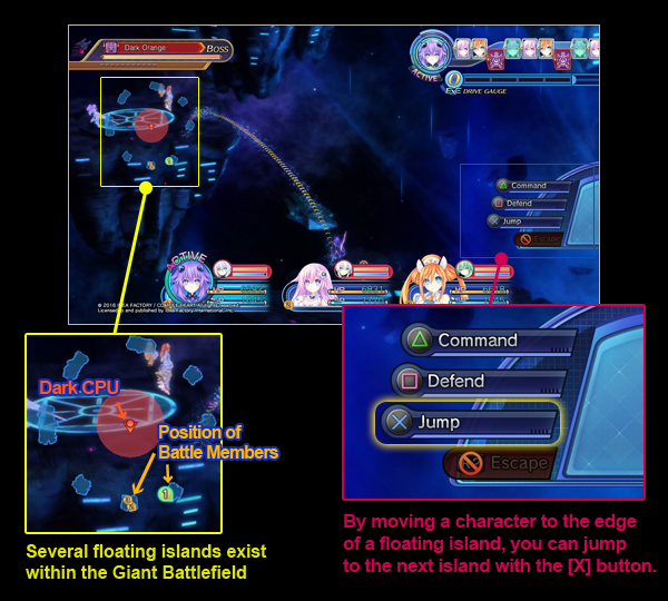 By moving a character to the edge of a floating island, you can jump to the next island by pressing the [X] button.