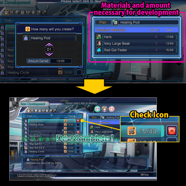 ※There are some development items that can be bought within shops once developed, but others that can only be obtained through Development.