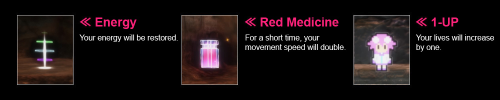 ※Be particularly careful about heights! Even a height of half a character's body is dangerous. Ghosts and Bats are enemies. A battle will occur if you touch them, and your "Energy" will decrease slightly.