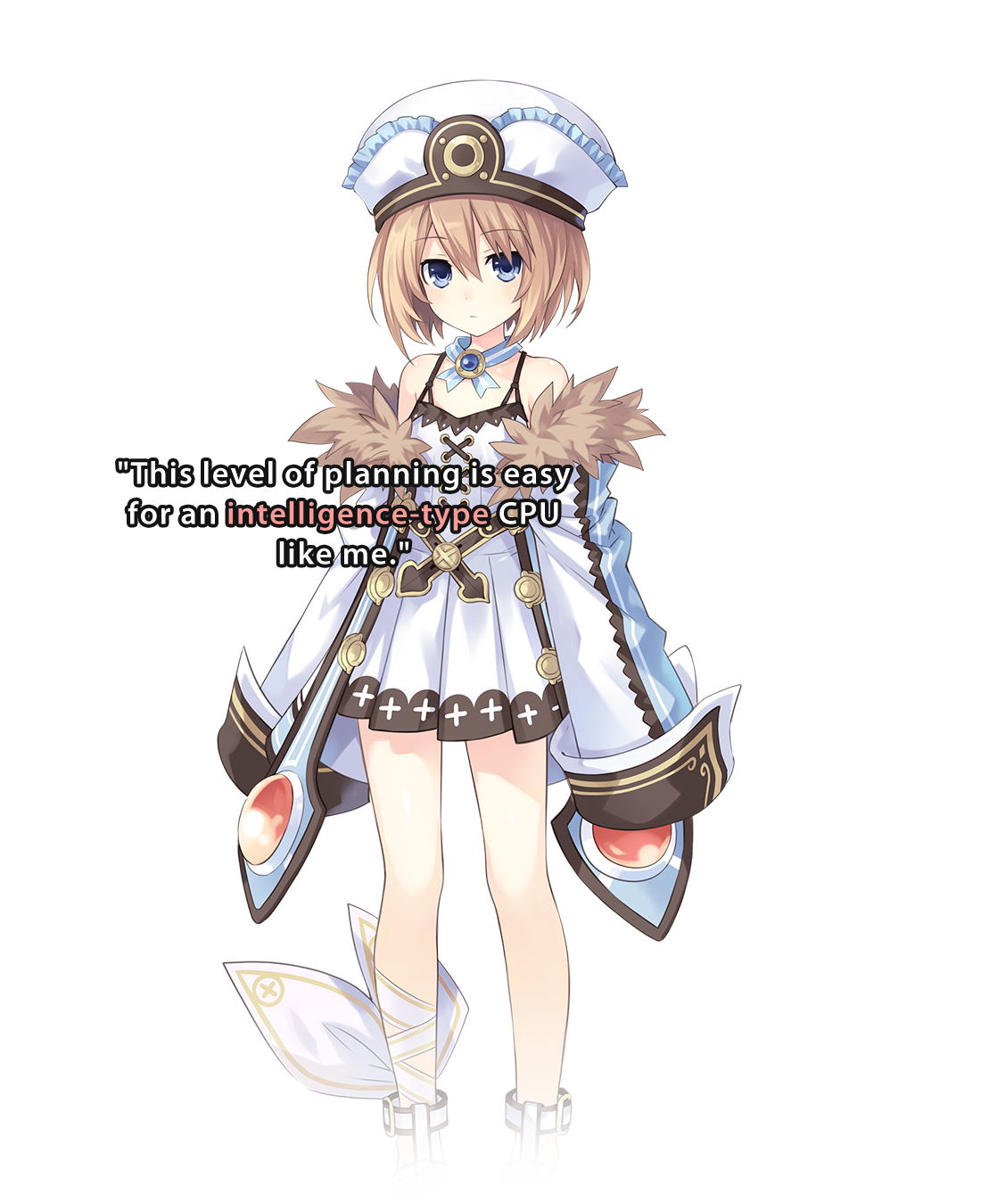 The patron CPU of Lowee. She normally has a calm and quiet demeanor, but when she builds up a lot of stress, she snaps into a rage and becomes almost completely impossible to tame. She's an avid reader and writer, and claims to be the most intelligent of all the CPUs. She's secretly been selling the novels she's written at conventions, but, for some reason, they don't sell very well. She often has trouble dealing with her younger sisters, but they all live together harmoniously for the most part.