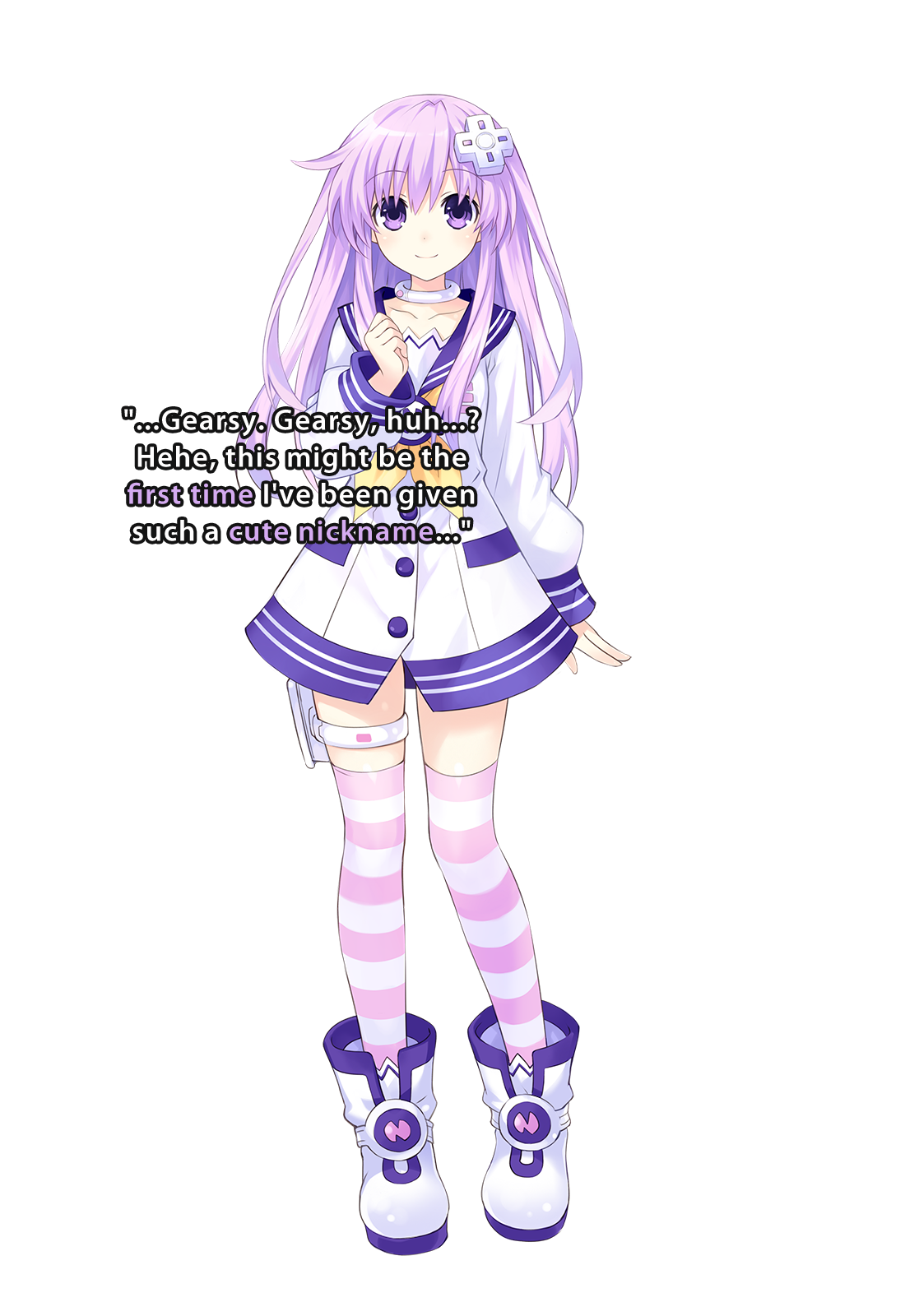Planeptune's CPU Candidate and Neptune's younger sister. She's surprisingly adept at tinkering with various machines and gadgets. In other words, she's a mecha-otaku. She's reliable to a fault. Nepgear loves Neptune to the point of coddling her at times. Histoire does not always approve of this behavior. She was even the protagonist in an earlier game! Unlike her sister who drags other people around to do her work for her, Nepgear's the type of person who supports those around her.