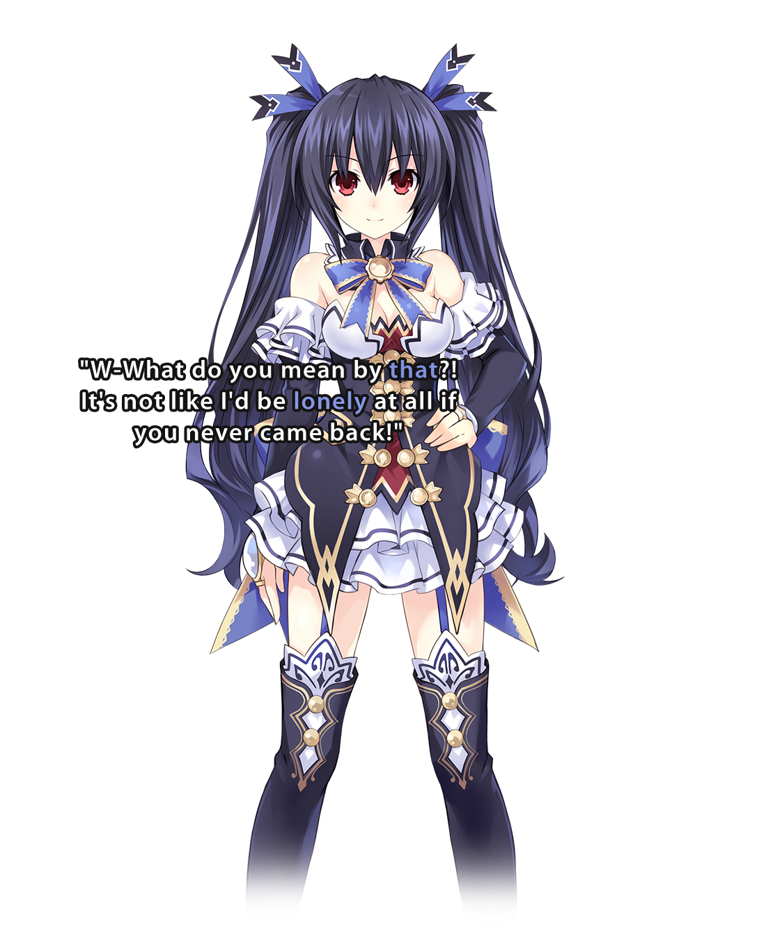 The patron CPU of Lastation. She has a serious disposition, and tries to do everything on her own. She's a classic tsundere girl that has a rather difficult time opening up to new people. Because of her personality, Neptune will often tease her and call her a loner. She hides it from the others, but her favorite hobby is making and wearing all sorts of cosplay outfits. Noire always ends up taking a harsh attitude with her younger sister, Uni. Their awkward relationship sometimes gives Noire a bit of anxiety.