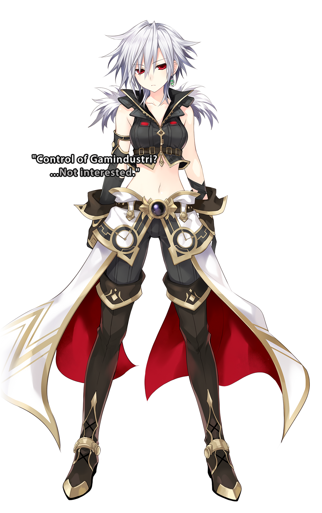 A young woman who's reserved and seems very cool, but has a considerably aggravated case of chuunibyou. She has two Dogoo-like monsters who serve under her. She's usually indifferent, and has a habit of saying "not interested" in response to just about everything. That being said, she does, however, show blind and passionate devotion to a certain person.