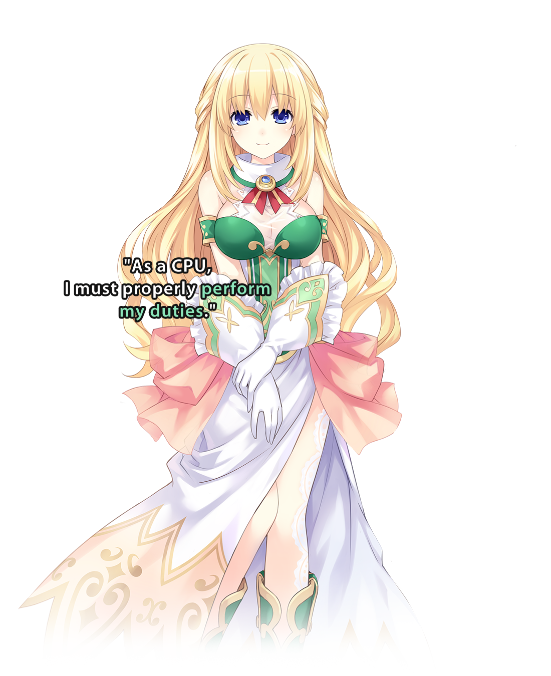 The patron CPU of Leanbox. Her outward appearance is that of a kind, mature older sister, but, inside, she's a hardcore games enthusiast. Her room is overflowing with games and merchandise. Vert has the utmost confidence in her style, and is quite proud of her physical appearance and gigantic... personality.