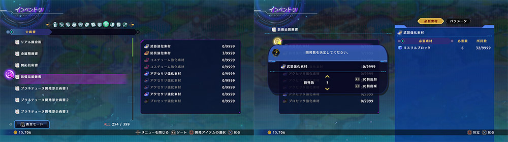 Plans detail the items you can create and the required materials. You can develop a new item by combining several items.
