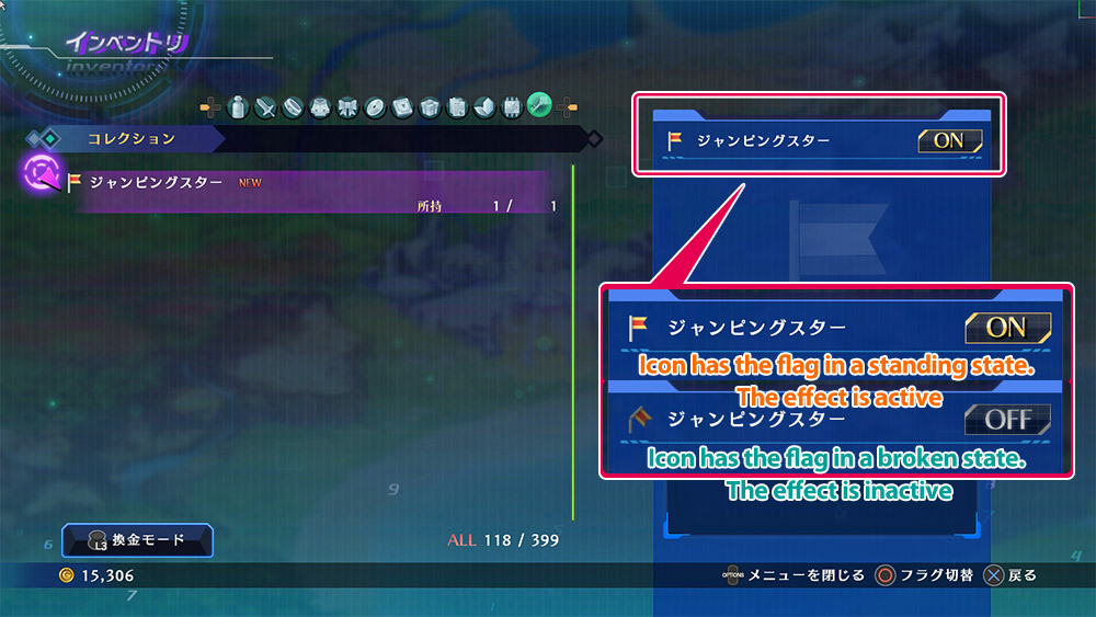 "Flag Items" are special items that have special effects on the game. You can select a Flag Item within Collection in your Inventory, and switch the status of the effect ON/OFF.