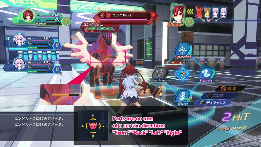 When attacking an enemy, if you attack in the direction a Part belongs to, you will deal damage to the Part along with the main enemy. If damage is dealt to a Part, a yellow gauge will be displayed.