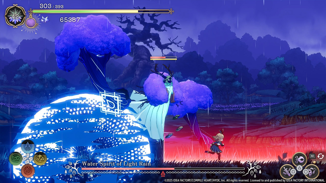 The boss, Water Spirit of Light Rain, attacks with water orbs and tree-like arms.