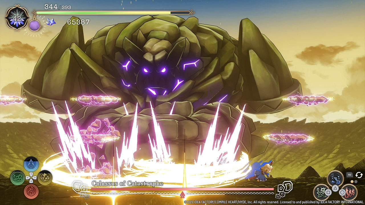 The boss, Colossus of Catastrophe, attacks in a wide range with giant arms and shockwaves.