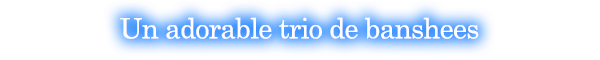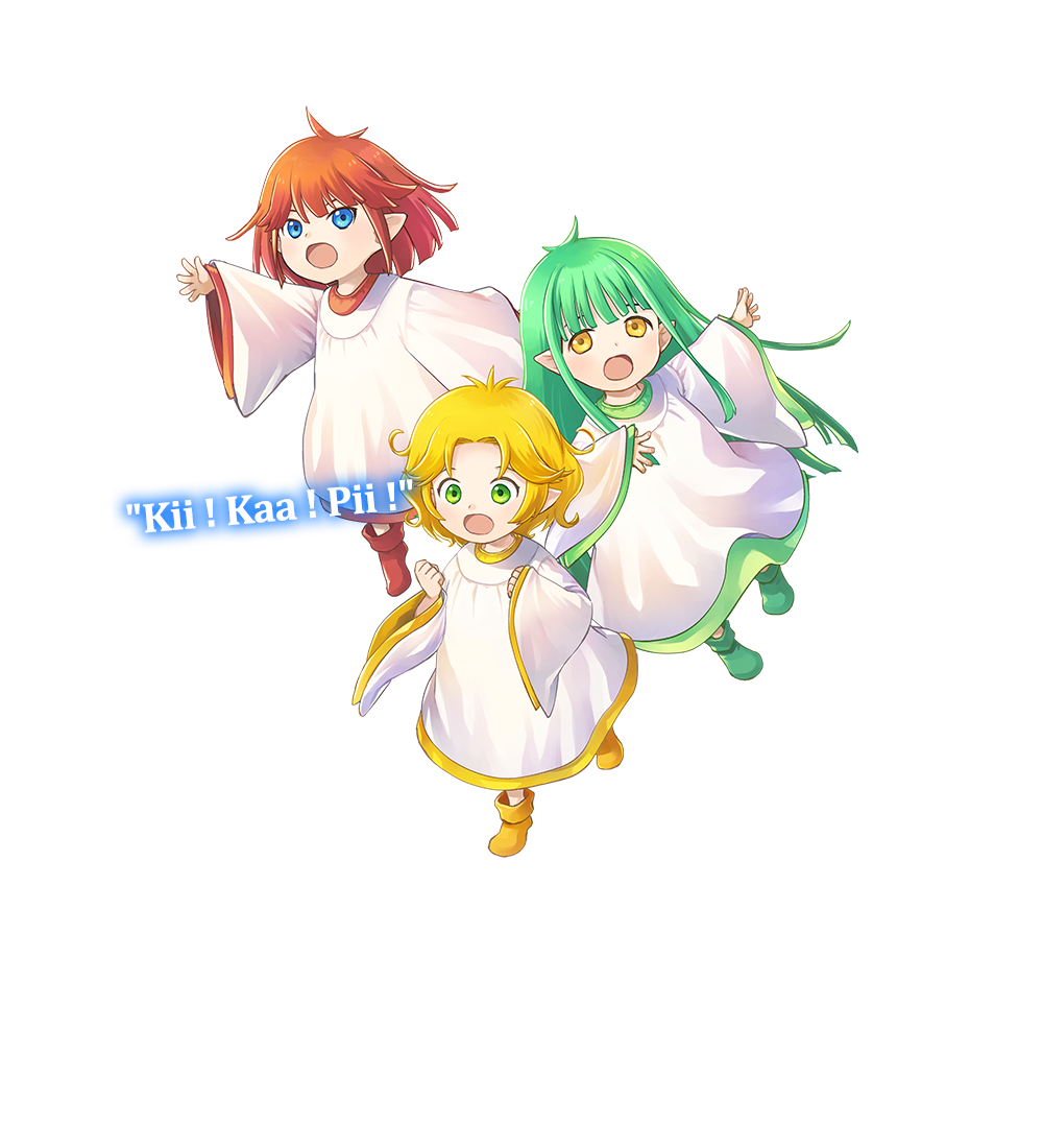 Celle qui a les cheveux verts, c'est Merig. La rousse s'appelle Shosu et la blonde Émi. Elles adorent faire des farces et taquiner. Leurs voix résonnent dans l'esprit de manière agaçante.